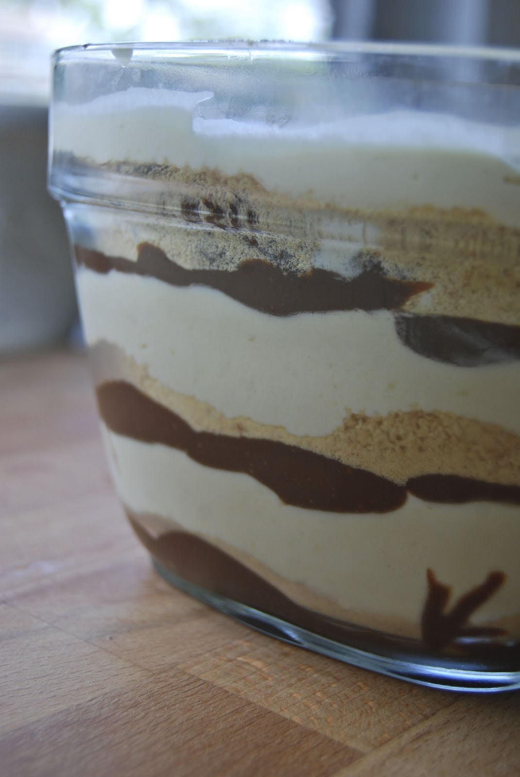 While the ice cream blends, make the chocolate fudge. Mix ingredients in a small sauce pan and bring to a boil over medium heat, whisking constantly. Boil until sauce begins to thicken. Remove from heat. Sauce will continue to thicken as it cools. Once the ice cream has finished processing, spread 1/4 cup of chocolate fudge in the bottom of a 1 quart container. Sprinkle with 1/3 of the graham crackers. Spread 1 third of the ice cream on top. Repeat layers, ending with ice cream on the top. Freeze for an hour or two to set before serving.